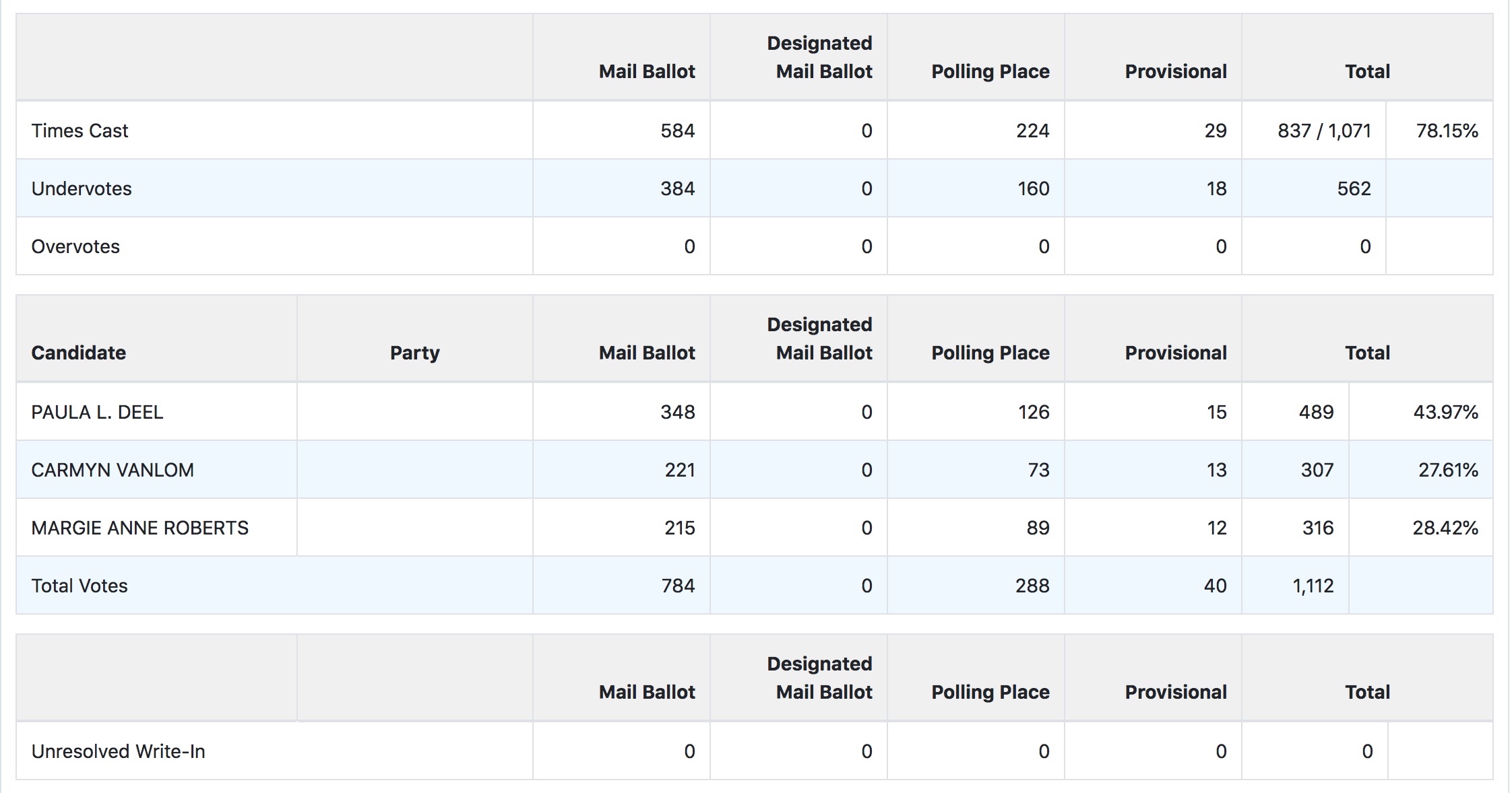Margie Roberts has edged out the second seat from Carmyn Vanlom